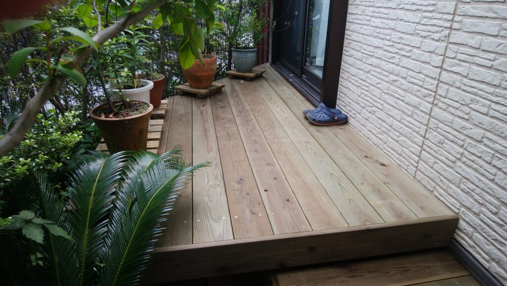 庭への階段として温かみのある、国産材由来の高耐久処理木材のLBウッドでできています。