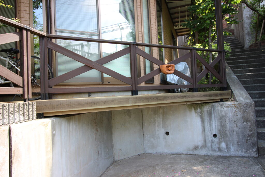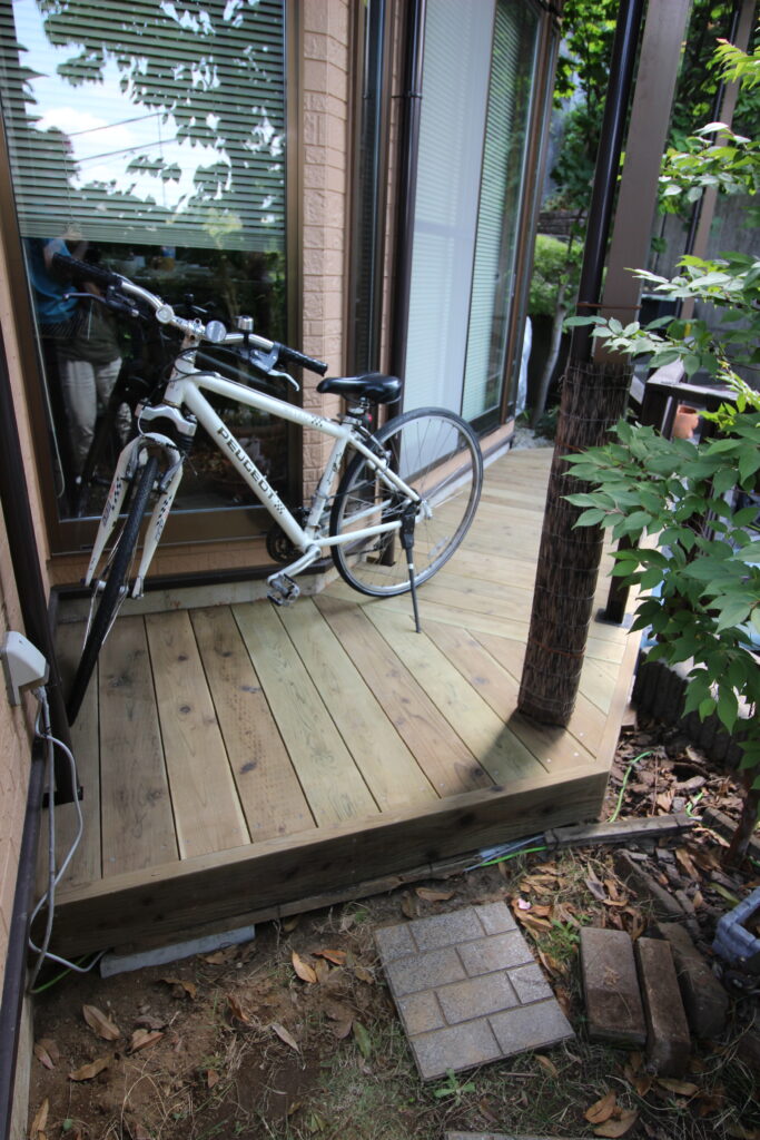 20cmほど、ちょうど一般的な階段の一段目ぐらい上がってるウッドデッキ