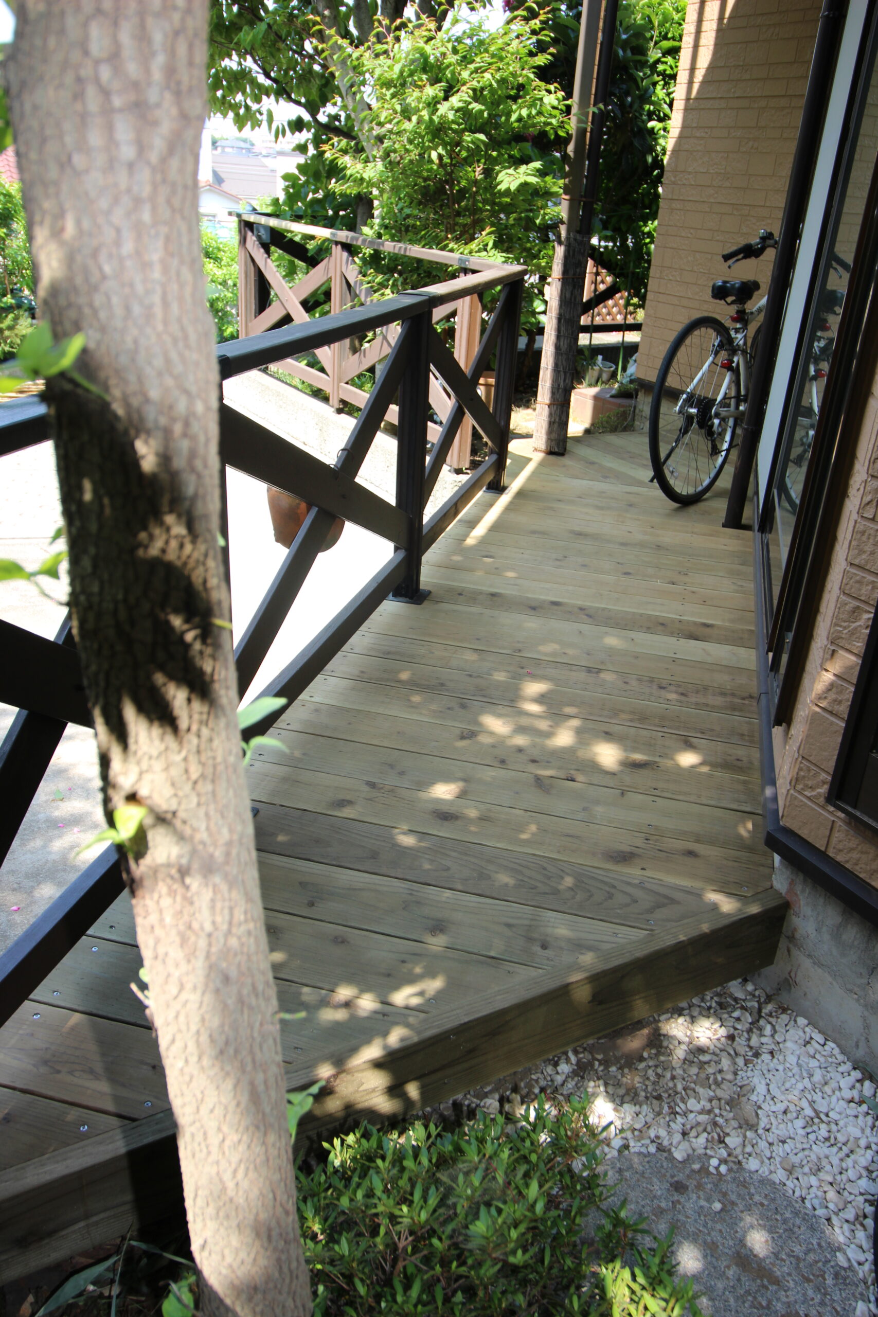 奥への細道のような、木渡しのウッドデッキ・・川崎市の宮前区にて、高耐久の特許材で国産材のLBウッドがつなげています
