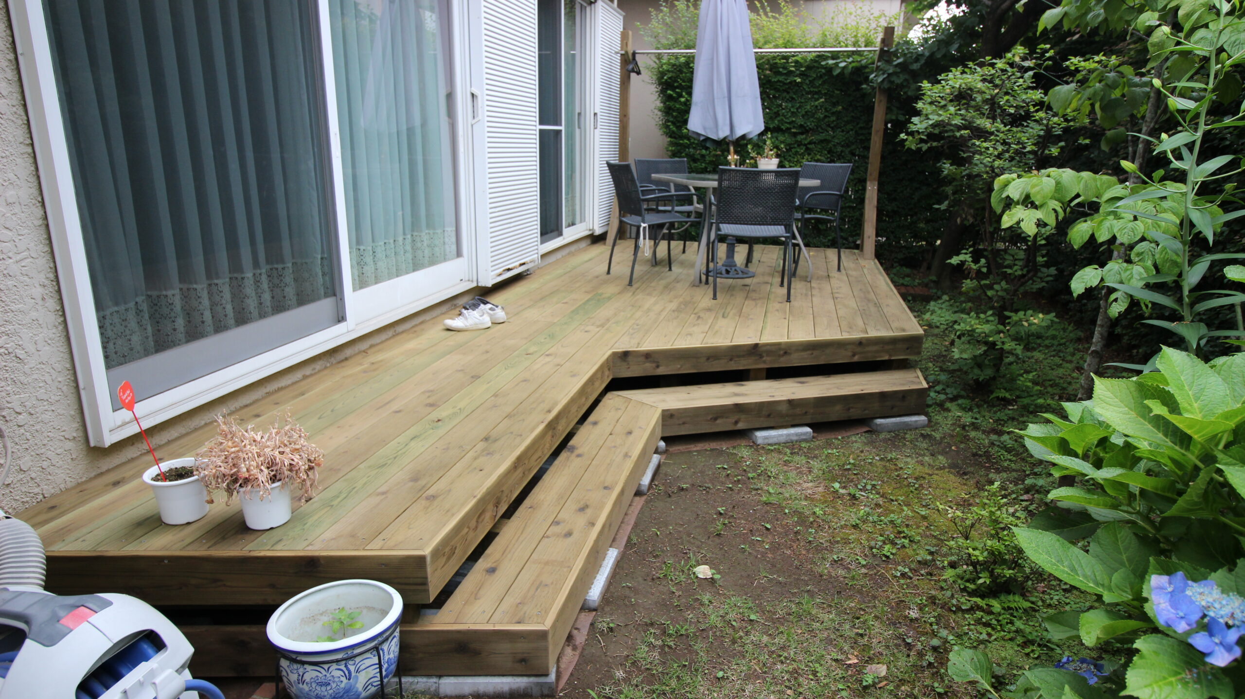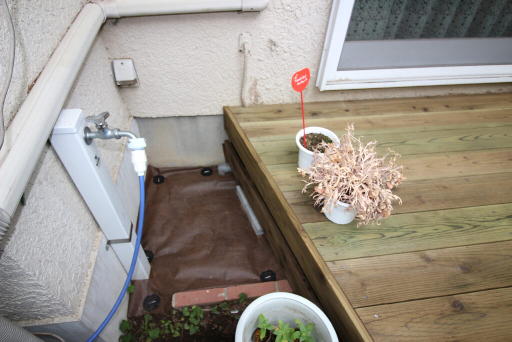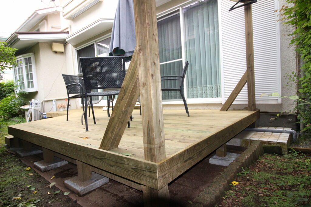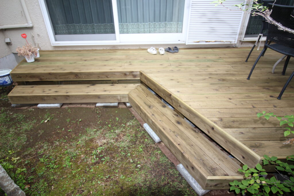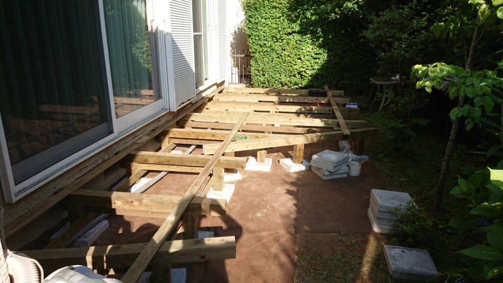 マスクで使われる不織布の防草シート敷いて、大引きと根太掛けで外形を作ります