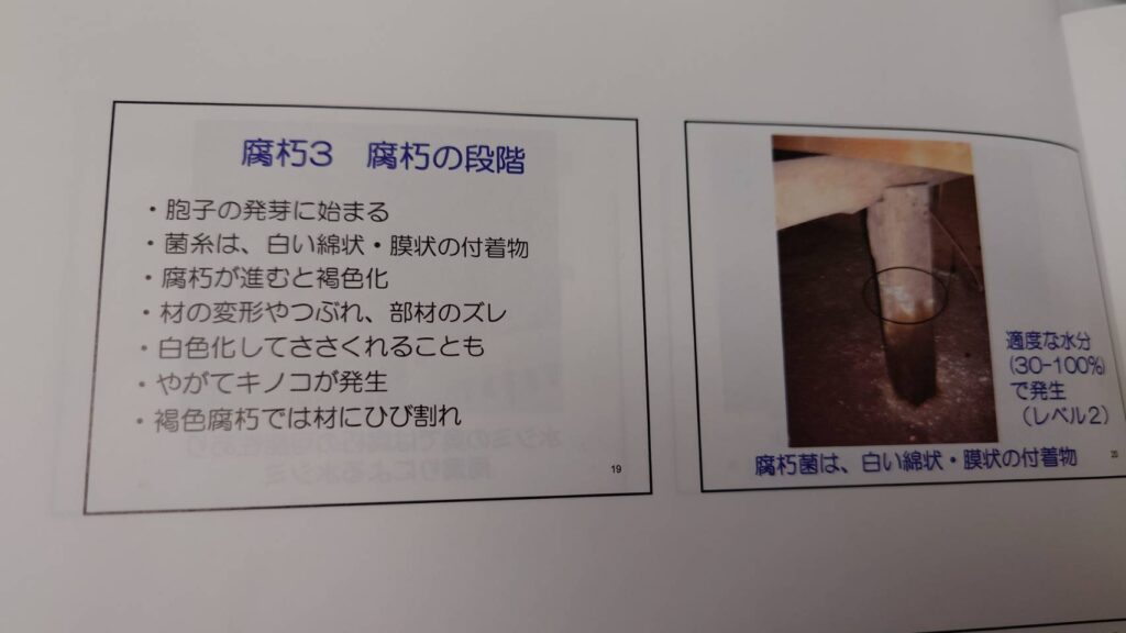 そう思い、ずっと木材保存協会さんの講習を興味を持って聞きに行ってまして、20年ほど前から木材劣化診断士の講習も。