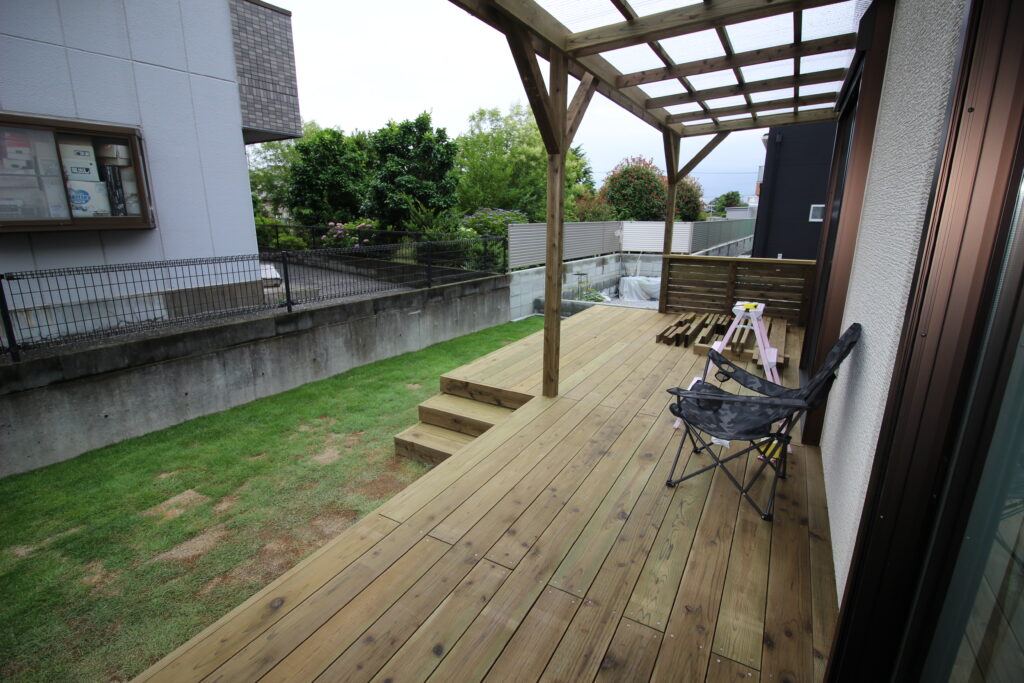 すべての南向きの部屋がウッドデッキでつながって、なおかつ屋根も付き、ちょっとした食事も作業もみんなできそう。