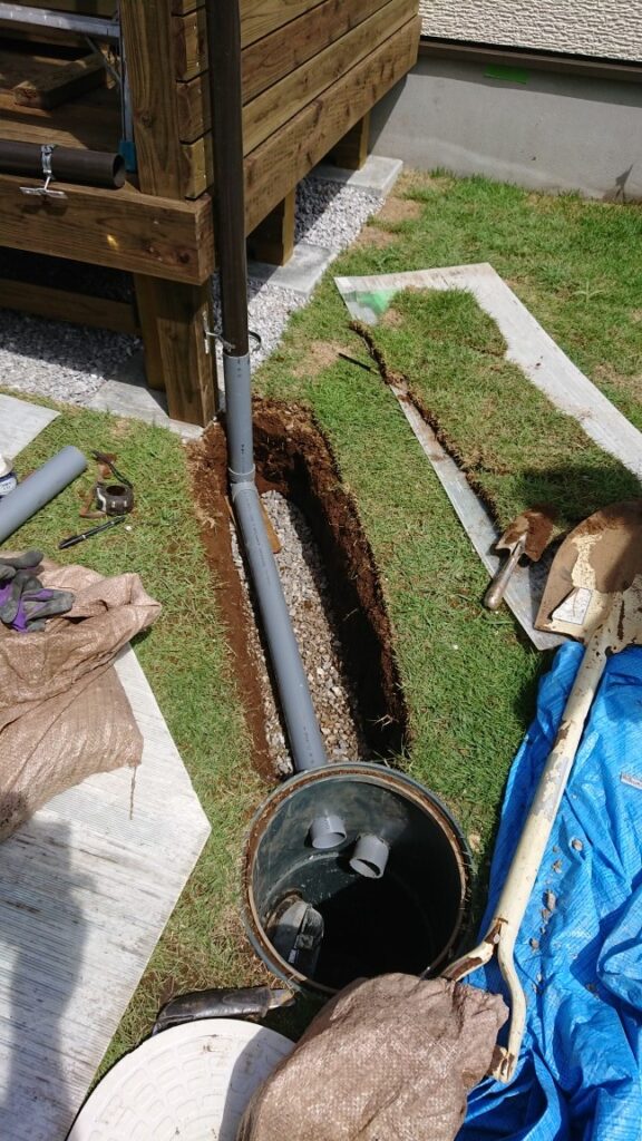 屋根の受ける雨水を、軒樋伝わって竪樋から雨水桝に落とす工事の配管