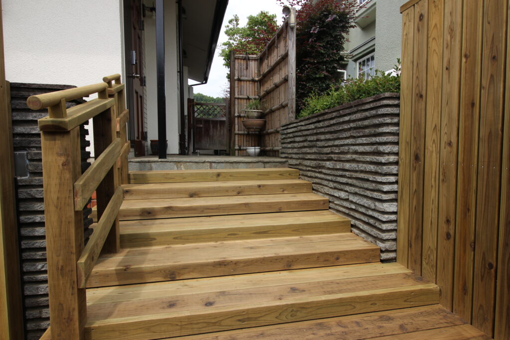 高耐久のソフトウッドのLBウッドで1段1段の踏む場所を広く、手すりも付けて。