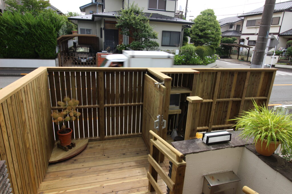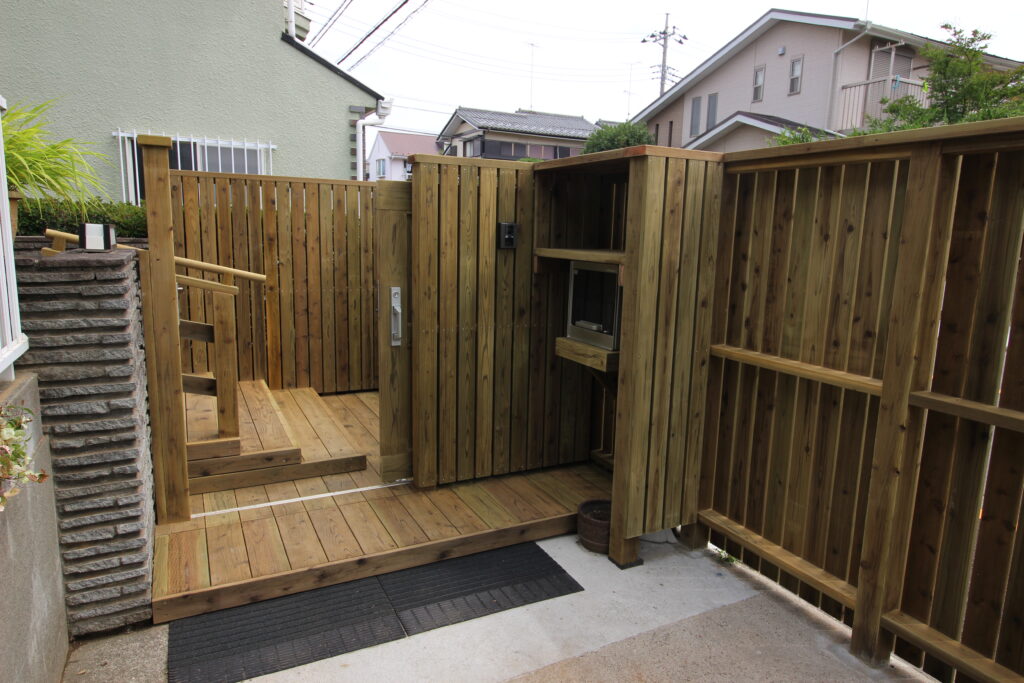 シニア向けの風情(玄関アプローチ、木製階段、手すり、棚付きウッドフェンス、最初の扉)・・町田市のウッドで作るエクステリア