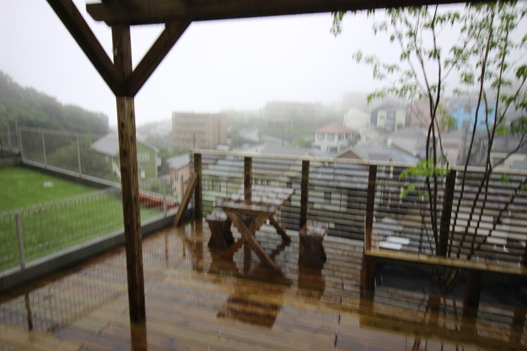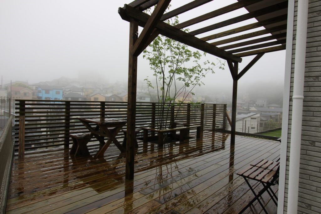 雨でも、いうに言われぬ情緒。自然の産物の木の質感に由来するのだろうか?
