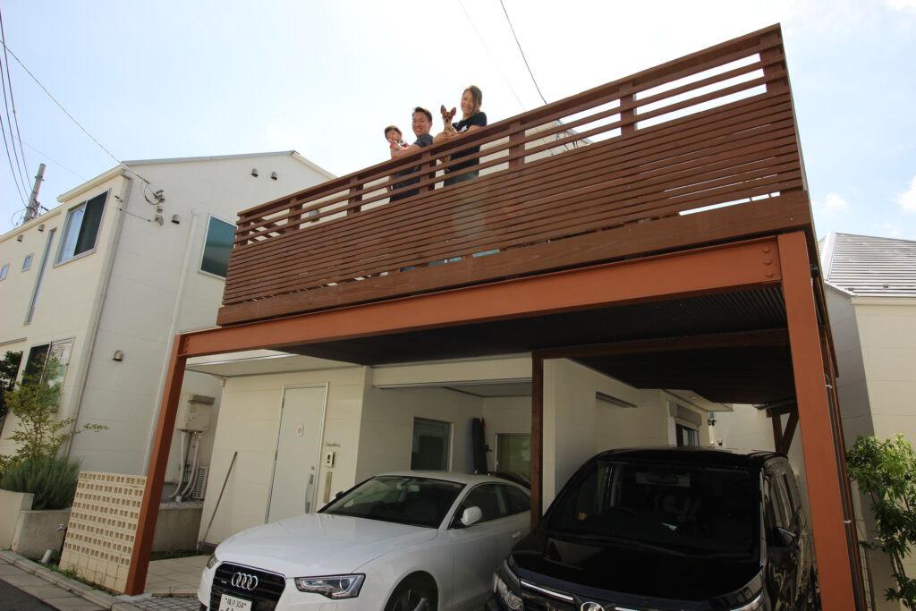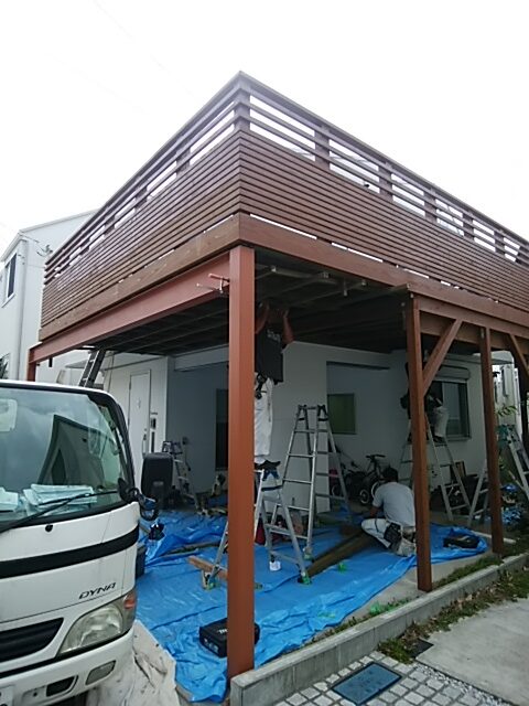 鉄骨が出来上がれば、そこに高耐久の国産材LBウッドで梁、桁、床材、フェンスを作り上げます。