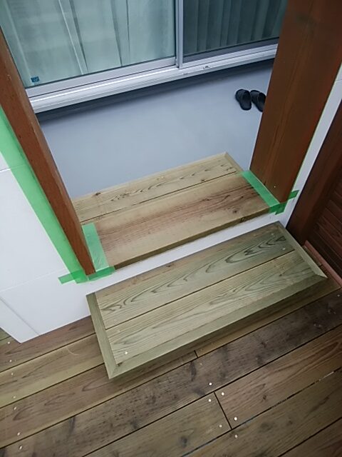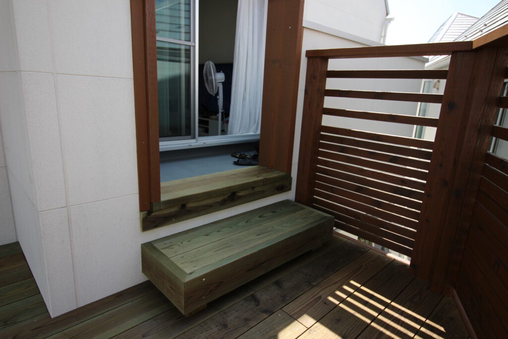 既存のバルコニーの壁を壊して、ウッドデッキに接続させる部分は、防水の観点から、一番といってもいいほど重要な取り合いです。