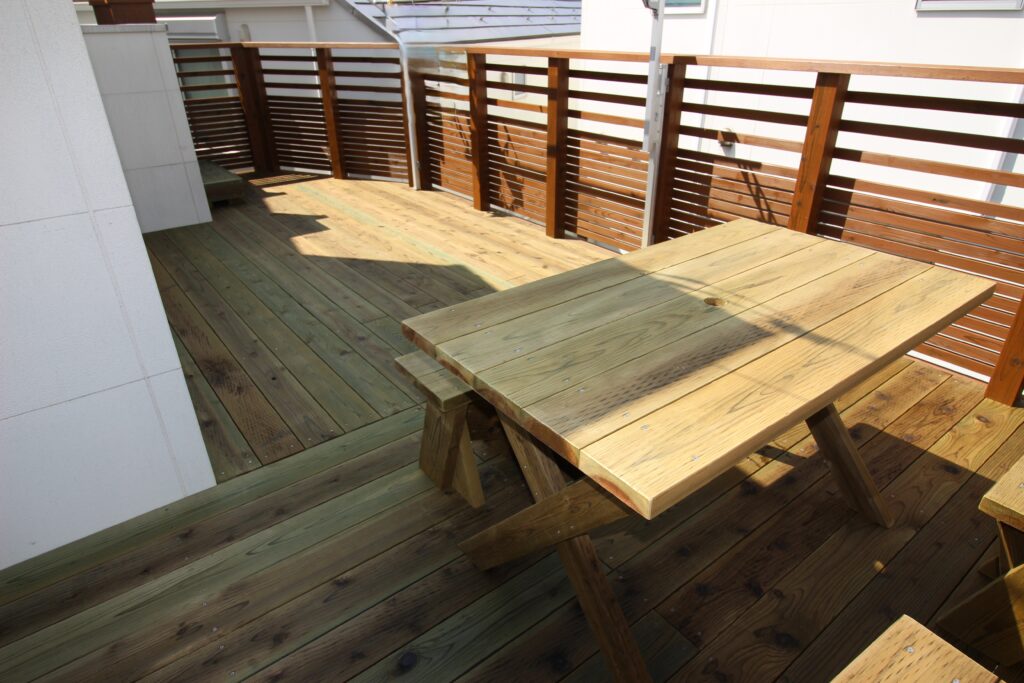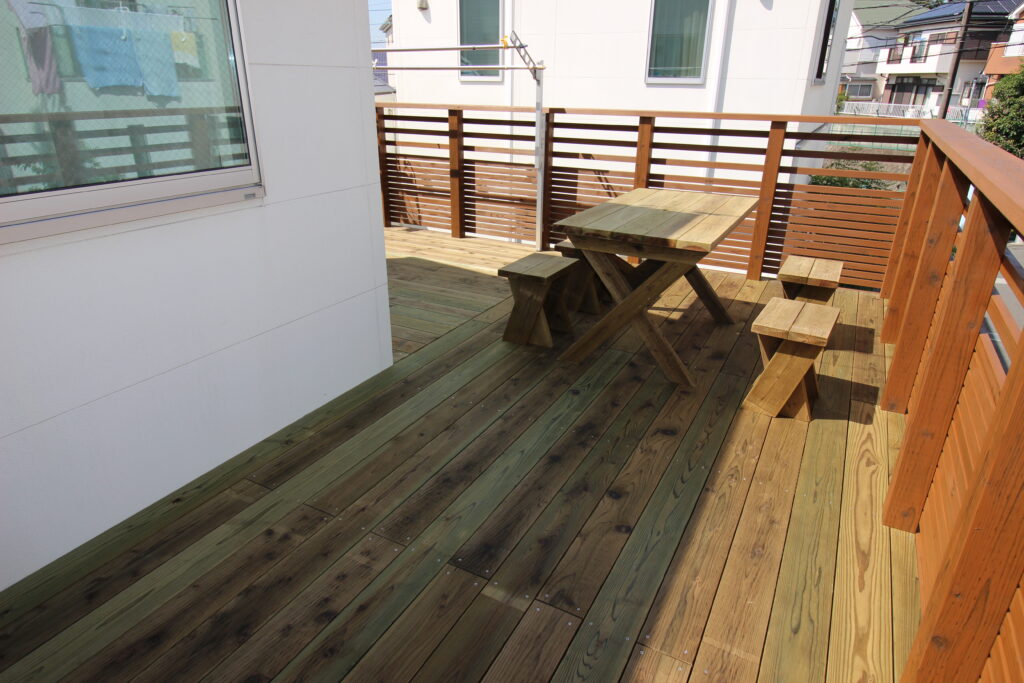 L字型のウッドバルコニー、LBウッドのテーブルとイス
