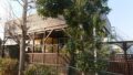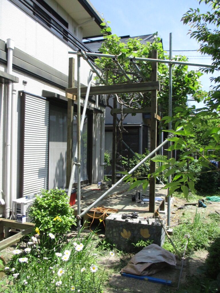 柱の位置はどうしても動線の関係で壁から離れることになり、工事中単管で揺れを止めてから根太掛けを壁に打ち、桟を這わせ、方杖を取って固定。