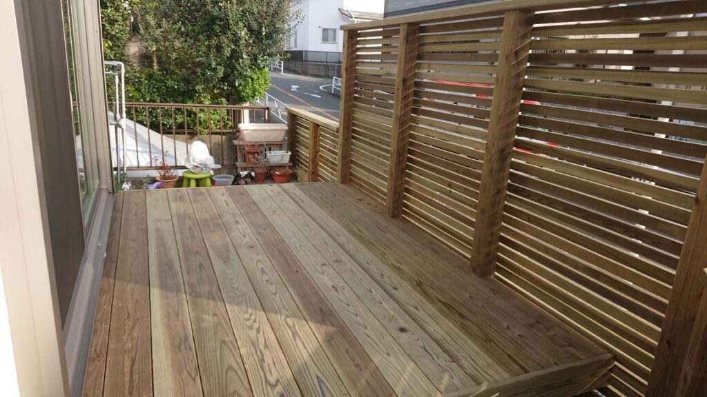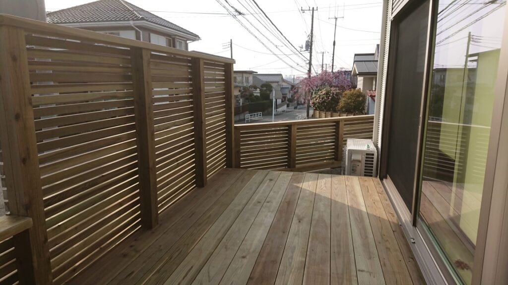 歩道もあり、車道もあるので、歩行者や自動車からの視線は見上げないと見えませんけど、目かくしをしてプライベート空間で楽しみたいとの話でこういう造りになりました。