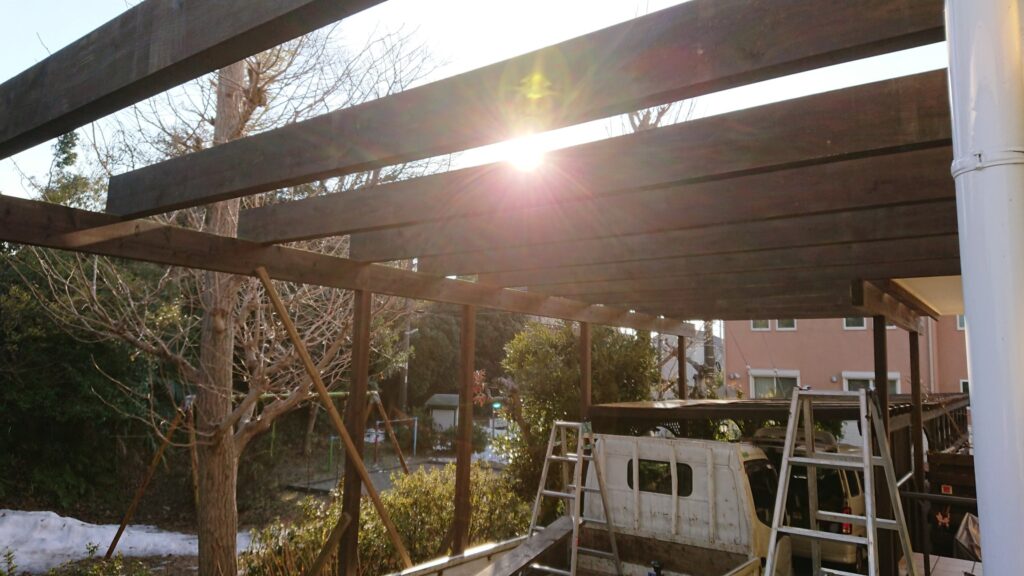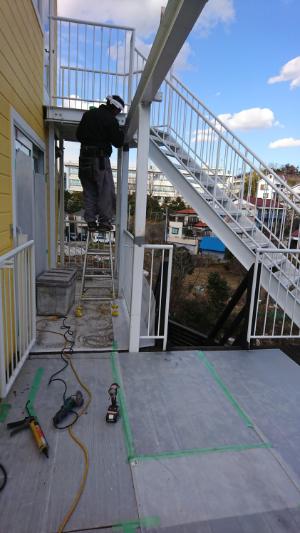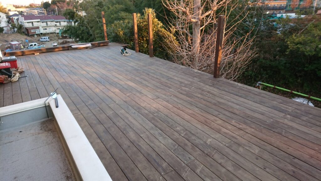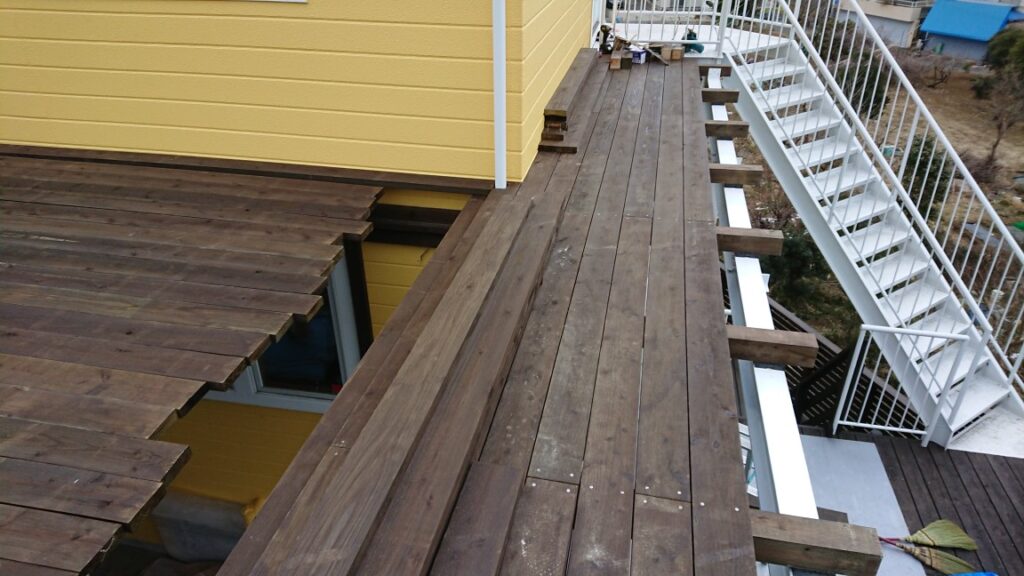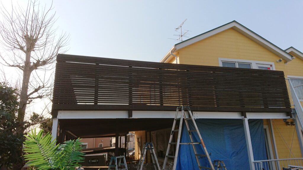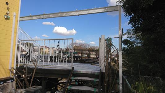 下のウッドデッキ(弊社製)の上に鉄骨組んで、2階の木製バルコニーを作ることに。