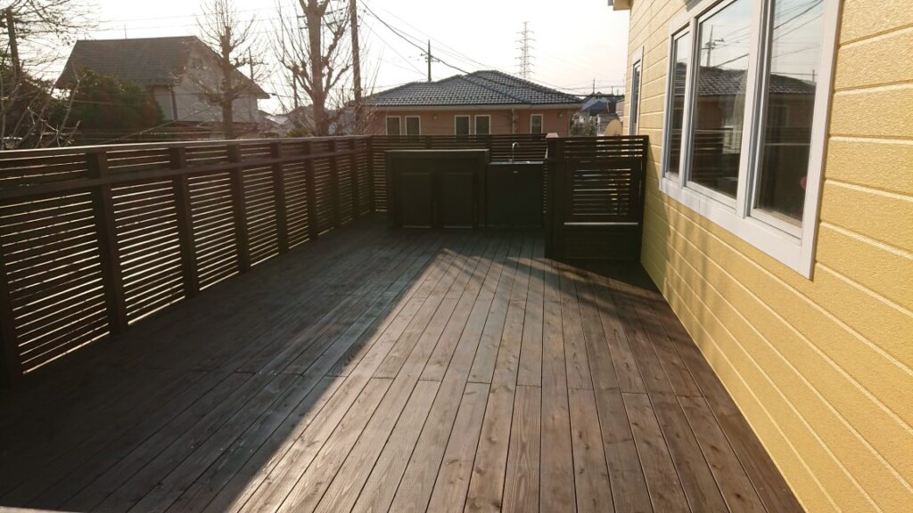 2階と繋がるウッドデッキ(ハイデッキ)。