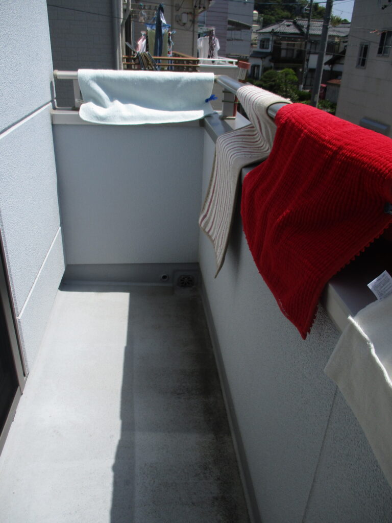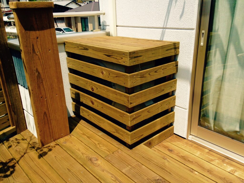 室外機カバーの横に、幅広い板が貼られてるとこが従来のバルコニーの手すり部分です