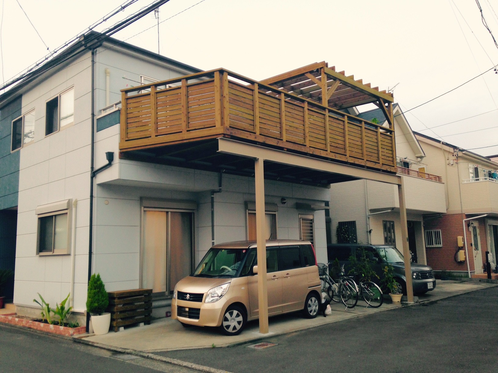 この自動車の上にバルコニー(車庫上デッキでもある)を鉄骨を躯体にして作ったのです。