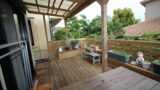 だいぶ、下から上がった所にあるウッドデッキで足場無しで梯子でずらしながら塗りました