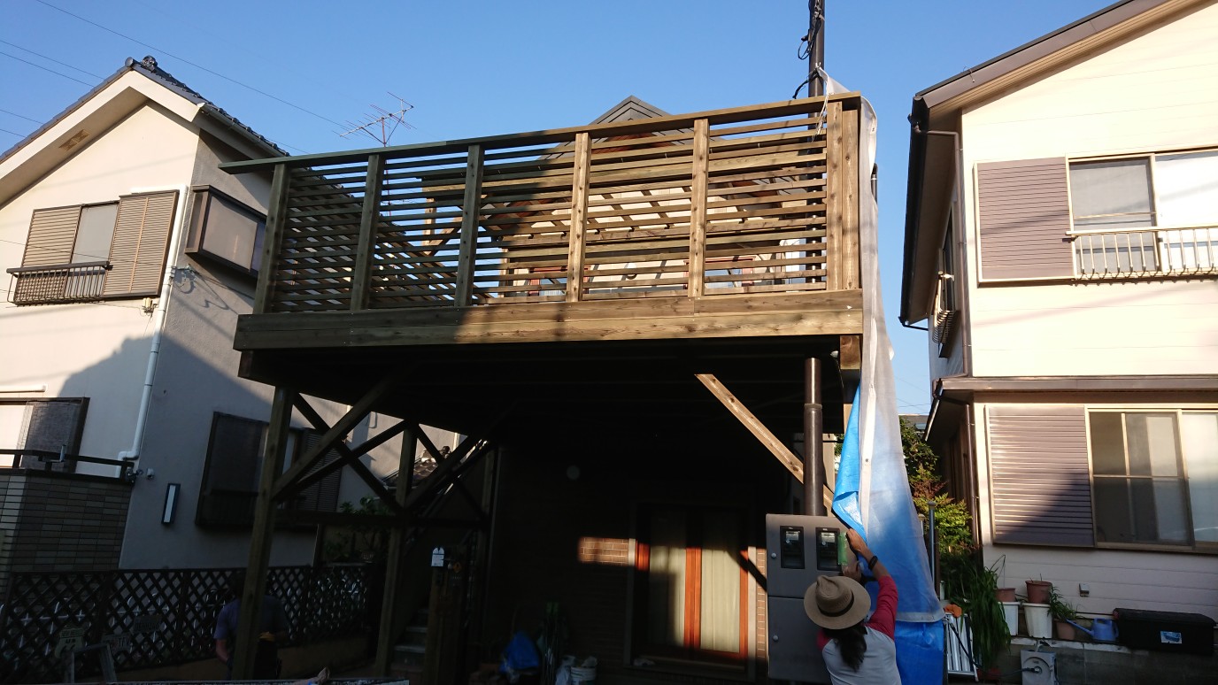 車庫の上のハイデッキ(ガレージデッキ)は屋根付き部分とそうでない部分で使い方変わる・・川崎市高津区の車庫の上のウッドデッキ