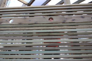高耐久のLBウッドですべて作られている。丸く抜き取ったフェンスの穴からみえる家々、