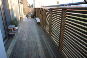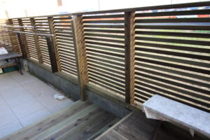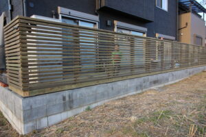 完全に目隠しするのではなく、風と光を取り入れたいとのご要望でウッドフェンス(木製フェンス)の桟を細くしさらに桟(さん)のアキを調節