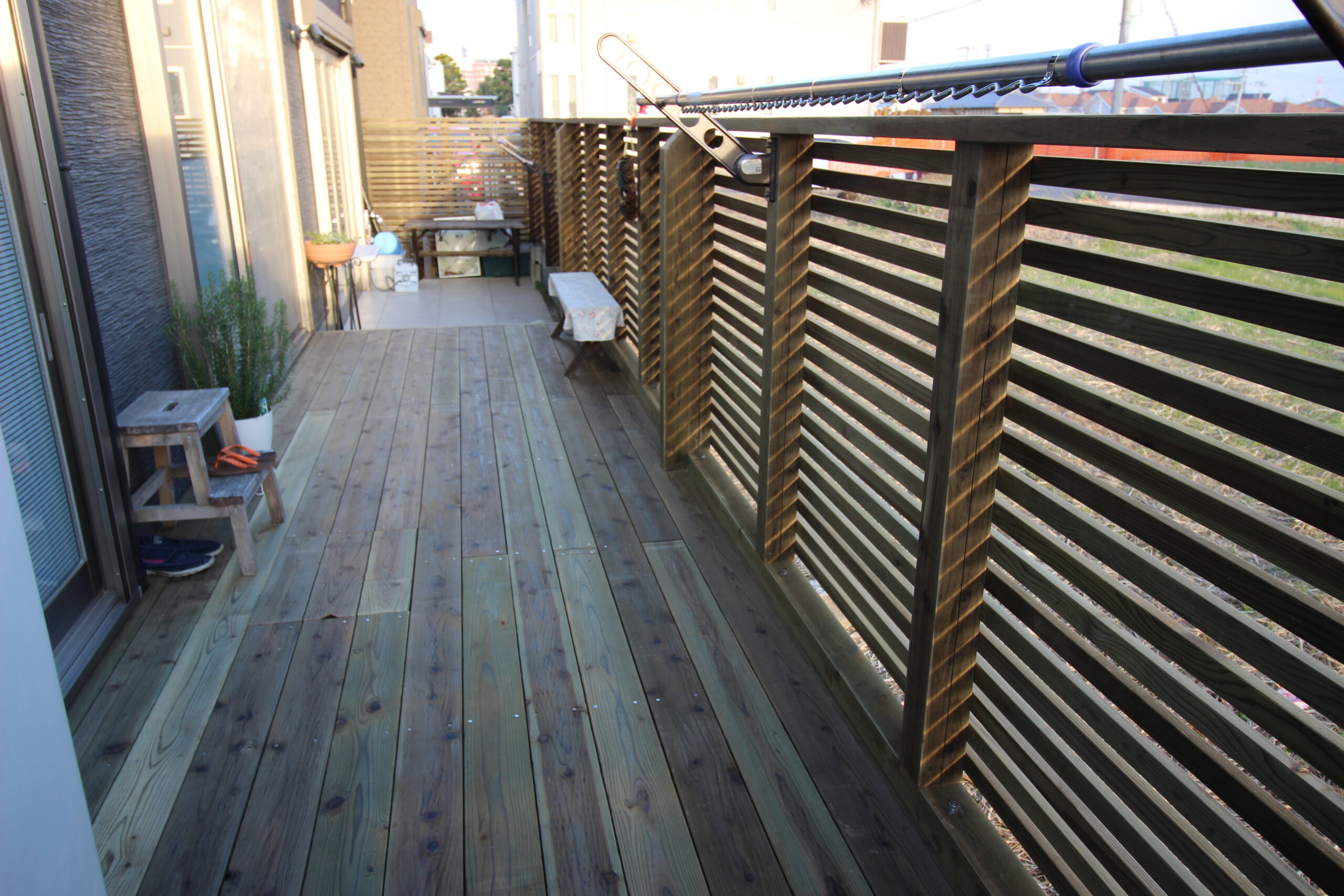 このウッドデッキは、洗濯物干しもあり、またお子さんの遊び場でもあり切っても切り離せない生活空間です