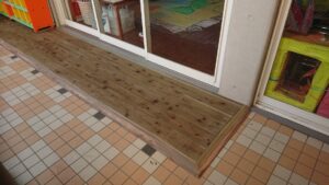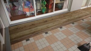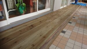 外部に面しているので、下屋があるとはいえ雨が降り注ぎ、長い間に腐朽しやすいし、固いハードウッドだと、裸足の足に刺さるとケガするので弊社のLBウッドを採用していただきました