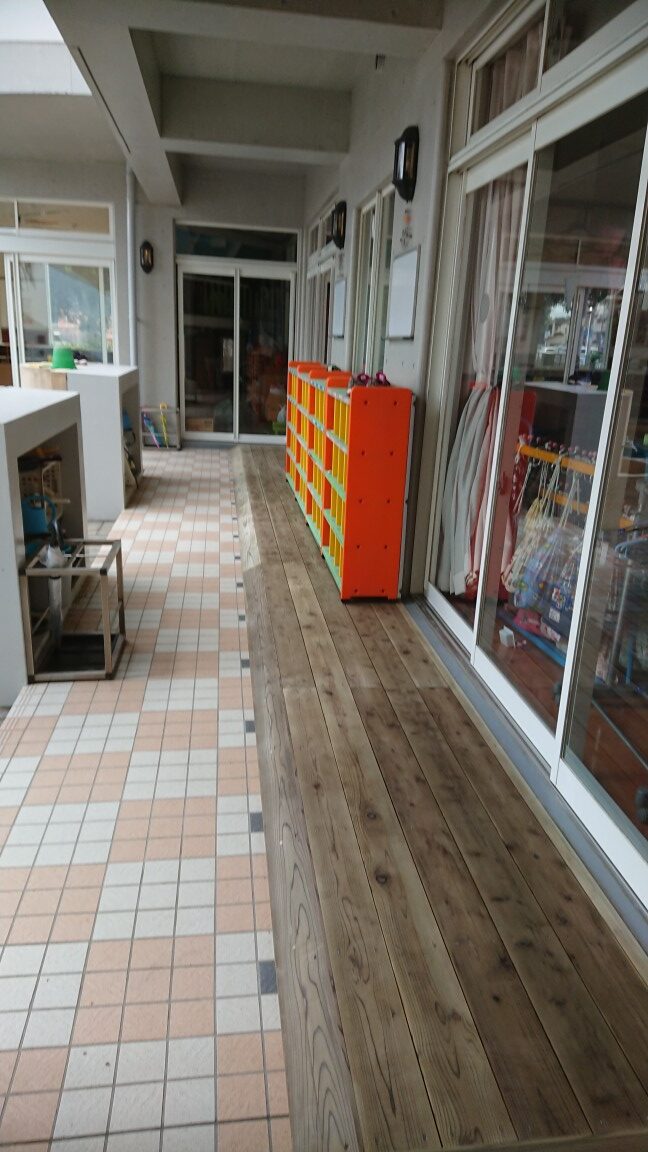 外の廊下で、段差でつまずかないよう斜めに段差を削っています