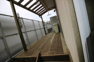 この屋根をつけることで(木製のパーゴラにポリカーボネイトの屋根付けました)洗濯物を干すスペースが出来上がりました。雨でもアウトドアに出ることもできます。
