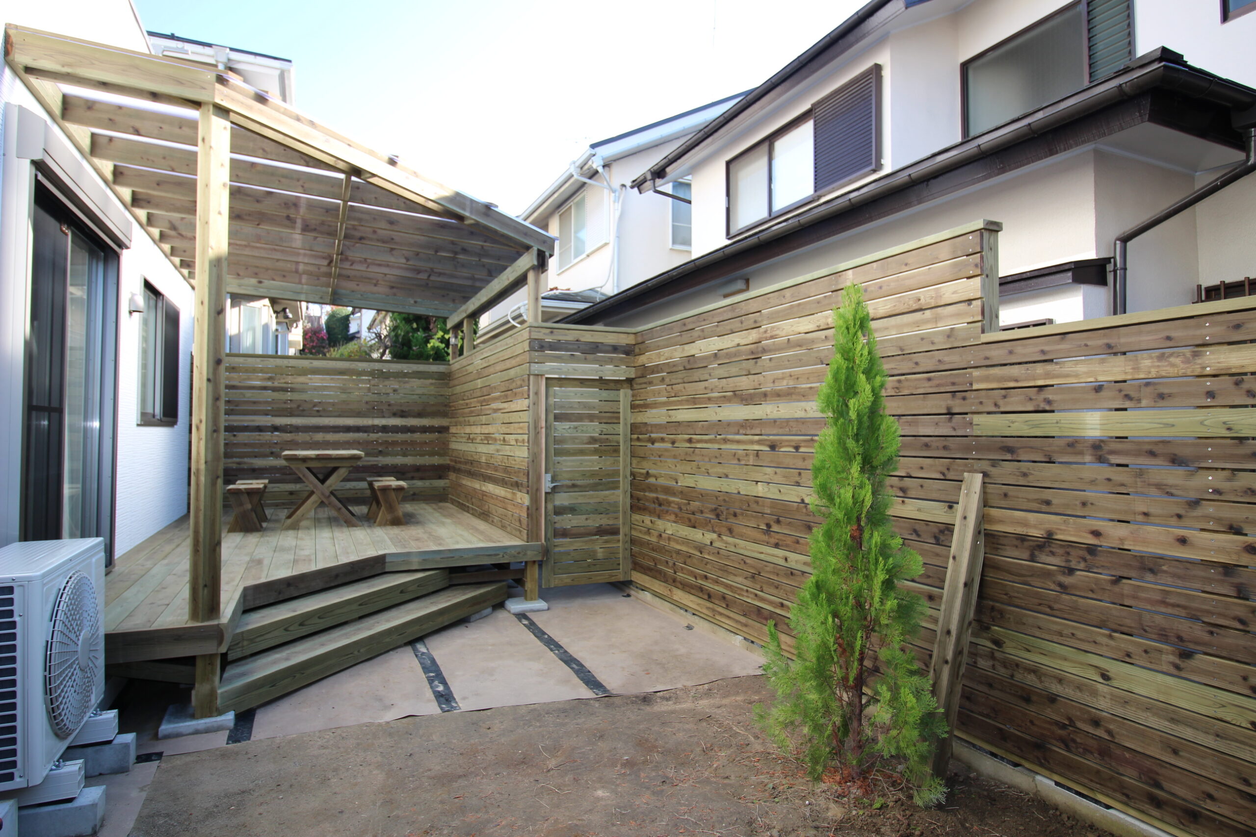 屋根付きのパーゴラがウッドデッキを覆う。木製のフェンスが外を囲う。すっと立つ一本の植木がワンポイントで庭を引き立たせているようで・・・