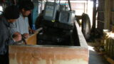 まず、インサイジング(人工的な微細加工)を行い、ACQ防腐剤を加圧注入。