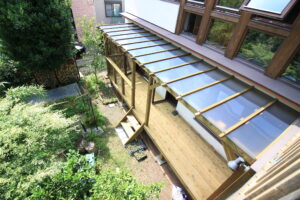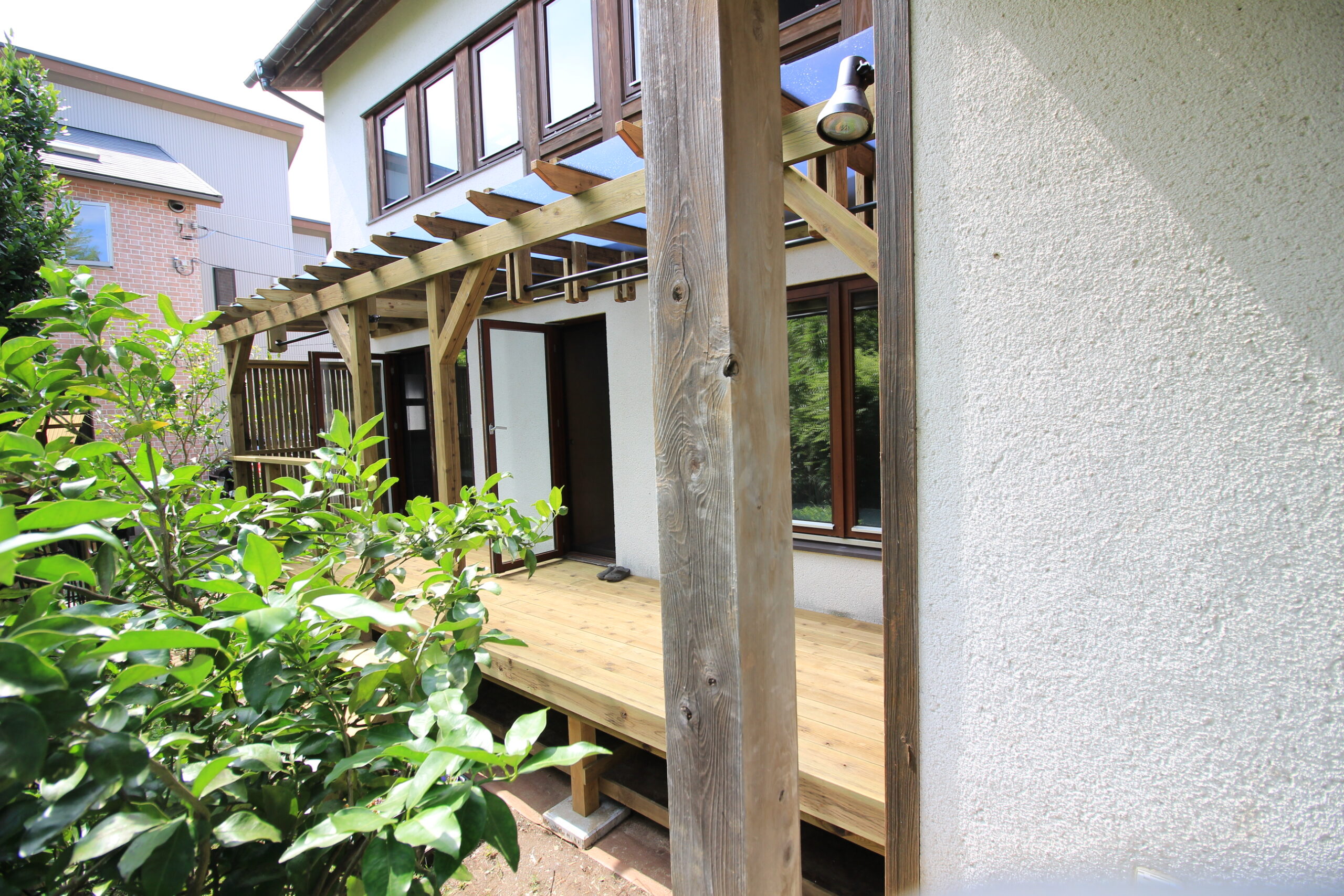 見おろす、ウッドデッキ。庭園と相まって美しい形
