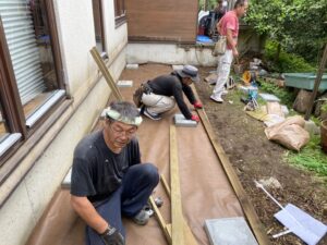 まず、雑草が生えにくくするための防草シートはり、平板をおいたり、接合部はペグ打ちで止めます