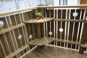 フェンスの角にR型の棚板。フェンスを丸く切り取ってシャボン玉のように