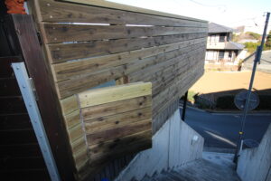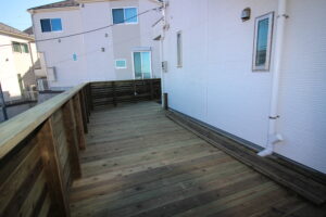 出来上がった擁壁のウッドデッキで庭が広がったようです