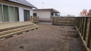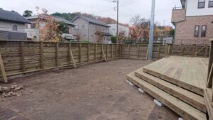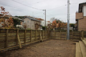 道路に面した側にウッドフェンスをコンクリート擁壁の上にたてました。