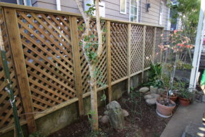 枠の中に手作りのラティスのパネルを差し込む。ラティスの桟の流れをきちっと合わせる