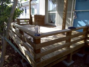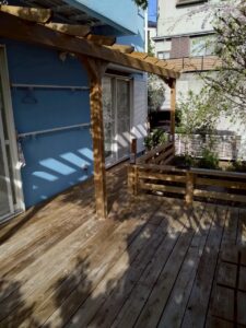 町田市のLBウッドで作ったパーゴラ付きウッドデッキのメンテナンス(高圧洗浄+DOT散布) ウッドデッキ工事(施工) X Facebook はてブ LINE コピー 2026.03.22 木製パーゴラが作り出す影がウッドデッキに映る 国産材ソフトウッドからできた高耐久LBウッド。 冬暖かく、夏は、それほど熱くない。 自由なデザインが可能です。 エルビーシステム ウッドデッキのお役立ちコラムデッキ一筋30年、代表太田が一所懸命執筆中!