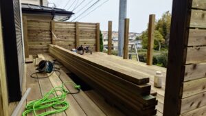町田市にてウッドデッキのハイデッキ工事中・・・道路から1mほど高いハイデッキ、ウッドフェンスを貼っている所 1階ウッドデッキ X Facebook はてブ LINE コピー 2026.04.15 http://lb-system.com/diary/wp-content/uploads/2026/03/02.mp4 弊社の社員のT社員。静かに丁寧にて手ノコで持ち出しの板を切っています 板は全部、フェンス材用。 エルビーシステム ウッドデッキのお役立ちコラムデッキ一筋30年、代表太田が一所懸命執筆中!