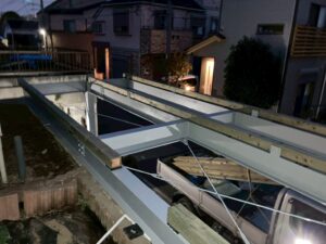 鉄骨の上に、土台を廻す。鉄骨と木の土台の間で熱伝導を低く抑えるために固形のゴムパッキングを挟む
