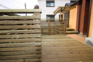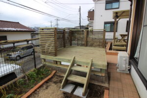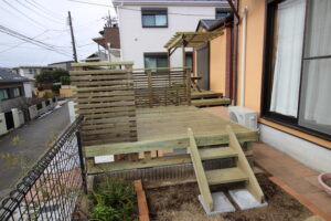 横浜市港北区・・ウッド・エクステリアで庭の雰囲気と利便性を解決、(ウッドデッキ、パーゴラ)が庭に3次元を呼び込む 1階ウッドデッキ X Facebook はてブ LINE コピー 2026.03.20 高台にウッドでの休息所。居間から離すと非日常の空間イメージになるようです。 居間と離すことで、その間を歩行し、玄関に水平移動ができる利点も。 エルビーシステム ウッドデッキのお役立ちコラムデッキ一筋30年、代表太田が一所懸命執筆中!