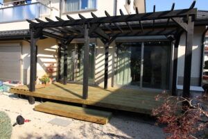 LBウッドでパーゴラとウッドデッキを。夏の暑さをさけ、炎天下でも安心して使えるように、サッシ越しに夏の強い日差しが入らないよう、このパーゴラにシェードを張るのです。