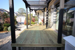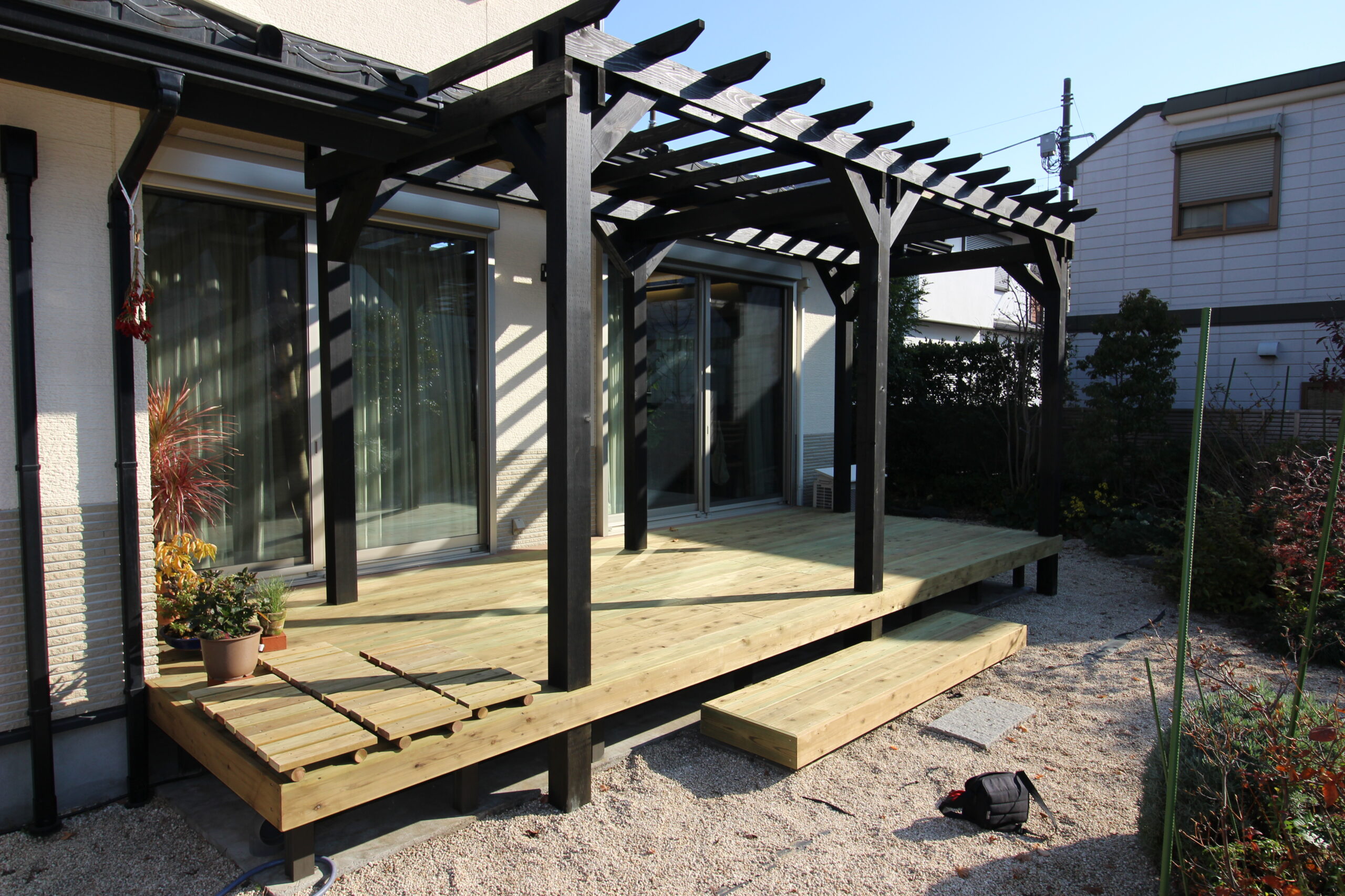 夏の日差しを防ぎ、ウッドデッキの表面が熱くなり過ぎない工夫もこのパーゴラに込められています。