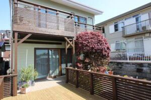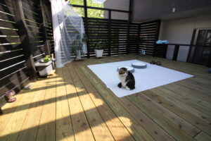川口市、藤沢市、海老名市の印象的なウッドデッキのある景色(ペットと、木製バルコニーとデッキ、飛行機とバルコニー 1階ウッドデッキ X Facebook はてブ LINE コピー 2026.03.29 下は車庫。ガレージデッキになっている。このネコの大広間 上は木製バルコニー、下はガレージデッキ ちょっと見えてるのは木製の3階のバルコニー(お客様に提供いただきました) エルビーシステム ウッドデッキのお役立ちコラムデッキ一筋30年、代表太田が一所懸命執筆中!
