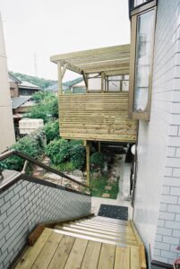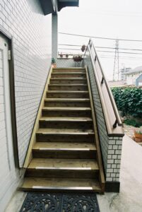 コンクリートの階段が木の質感で、コンクリートの人工物の感覚が消えています
