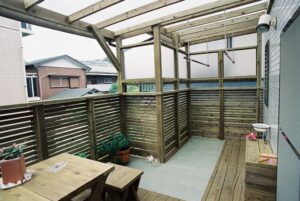 パーゴラに平板の屋根を付け、雨の降りこみを防いでいます。