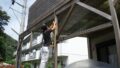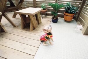 バルコニーの上ではペットのワンちゃんが、自分の領分の警戒にあたっていました