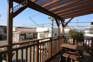 間口4.5m、奥行き3.7mのたっぷりとした広いバルコニーです。桁・梁の大きな部材もLBウッドで作れます。フェンスのデザインも色々できます。
