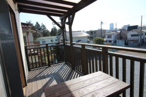 八王子市のウッドバルコニー(木製テラス、木製ベランダ)の上は洗濯のための屋根をポリカで貼っています