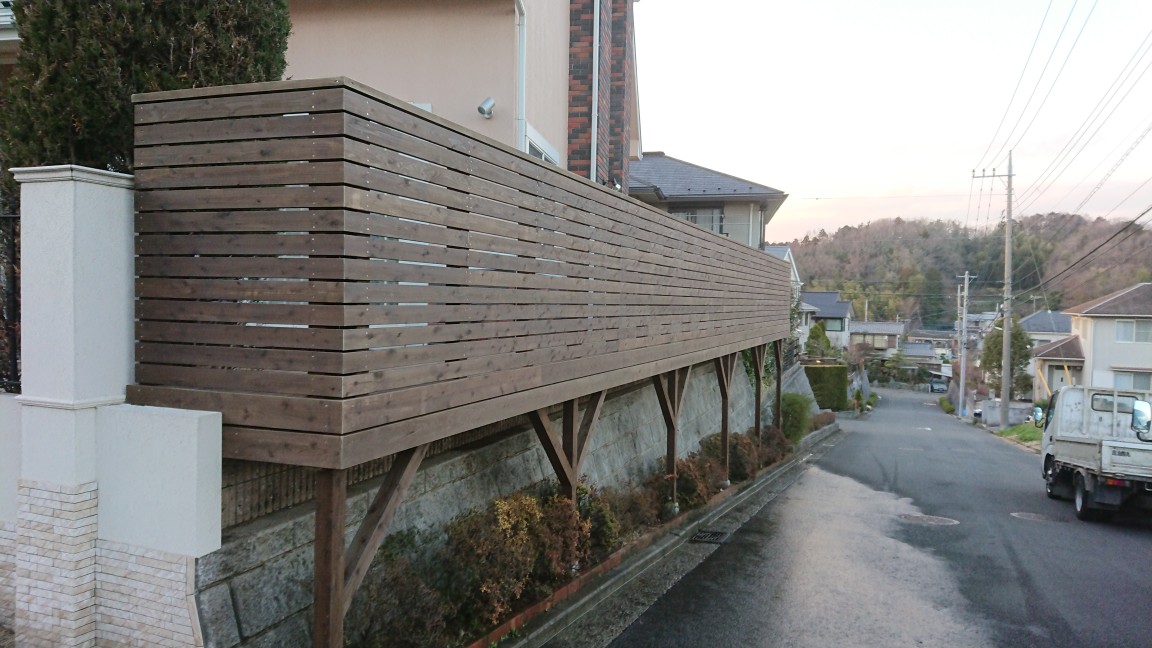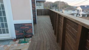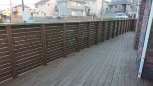 部分的に大きく拡がったウッドデッキにもなり、楽しめる空間になりました。でも、ただフェンスだけで仕切ってしまうと、このような歩行用の空間は取れずもうちょっと窮屈になったと思います。