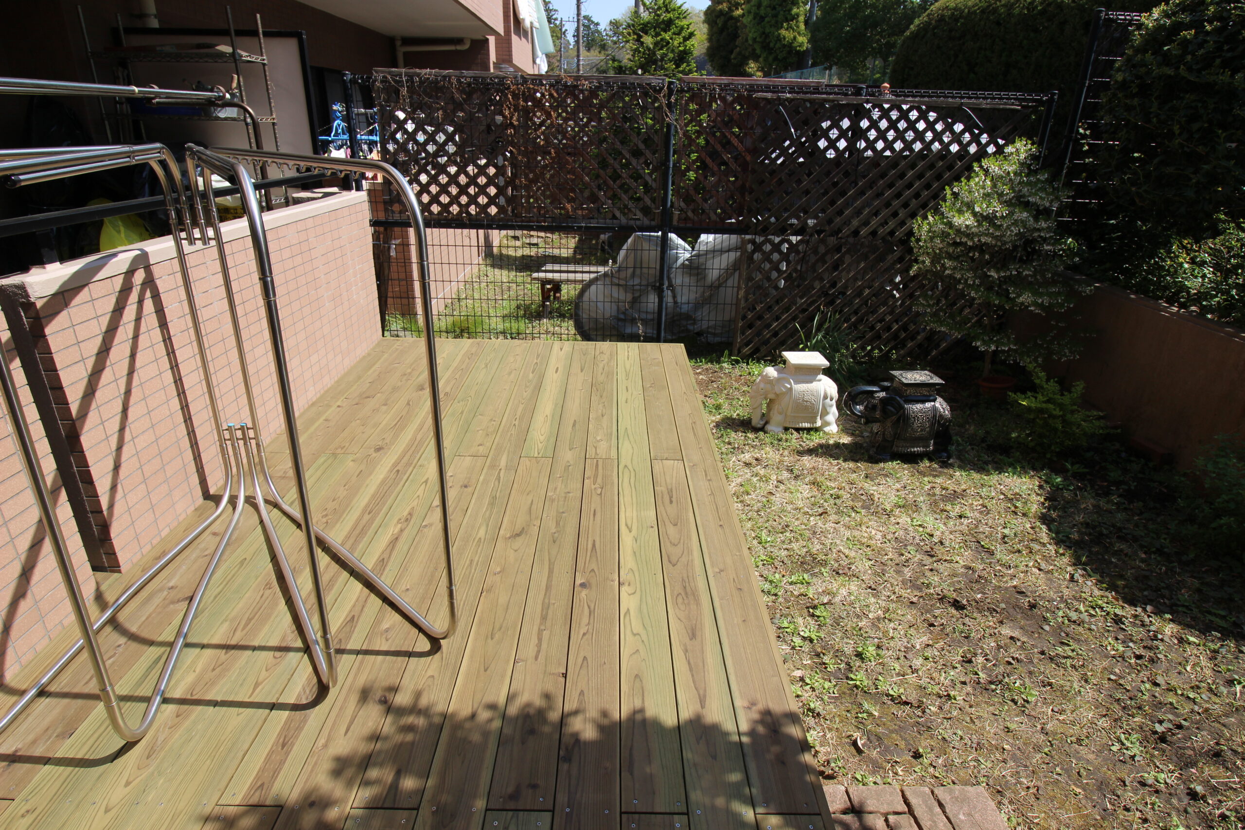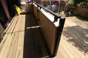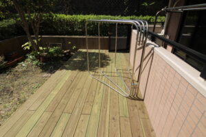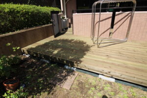 土の庭の方は、ウッドデッキの下が地面とデッキと距離がない。湿気が上がること、雑草が生えることを避けるため防草シートを貼りました。