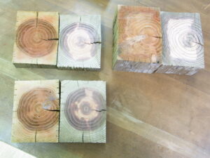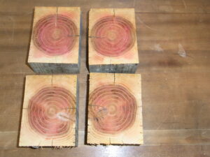 2個ずつの、組み合わせの、各右の材の緑色部分と芯部の赤黒い部分はACQの入ってる部分。
